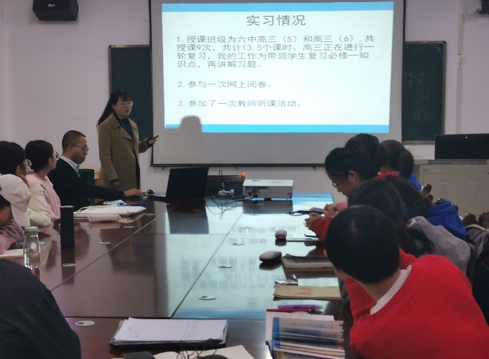 中期汇报会由生物科学系主任兼带队教师组长刘晓东主持,全体实习生参加了本次会议。他首先对一个多月的实习情况做了总结,教育专业实习不仅是人才培养的重要环节,也是打造实用型人才的主要途径,更是学校到社会的一次微跨越。随后,十三位实习生代表就自身教育实习内容、教学安排、感悟、反思等方面进行汇报发言。
