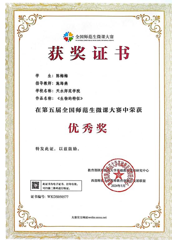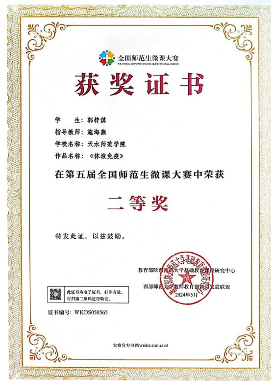 该项赛事分校级初赛和全国决赛两个阶段,通过积极动员、申报、筛选,Ky官网共推送5部作品参加校赛,施海燕老师指导,学科教学研究生制作的《体液免疫》《基因突变》和《生物的特征》三部微课作品在激烈的决赛竞争中脱颖而出,郭梓淇同学的《体液免疫》获第五届全国师范生微课大赛二等奖,马雯钰同学的《基因突变》、陈梅梅同学的《生物的特征》分别获第五届全国师范生微课大赛优秀奖。