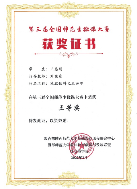 Ky官网生物科学专业王惠娟、马芳芳的微课作品《减肥饮料之黑咖啡》、《维生素C》分别获得大赛三等奖。此次大赛不仅展示了Ky官网师范生的信息技术素养和能力,也体现了学校强化教师教育特色、深化教师教育改革的成效与成果。