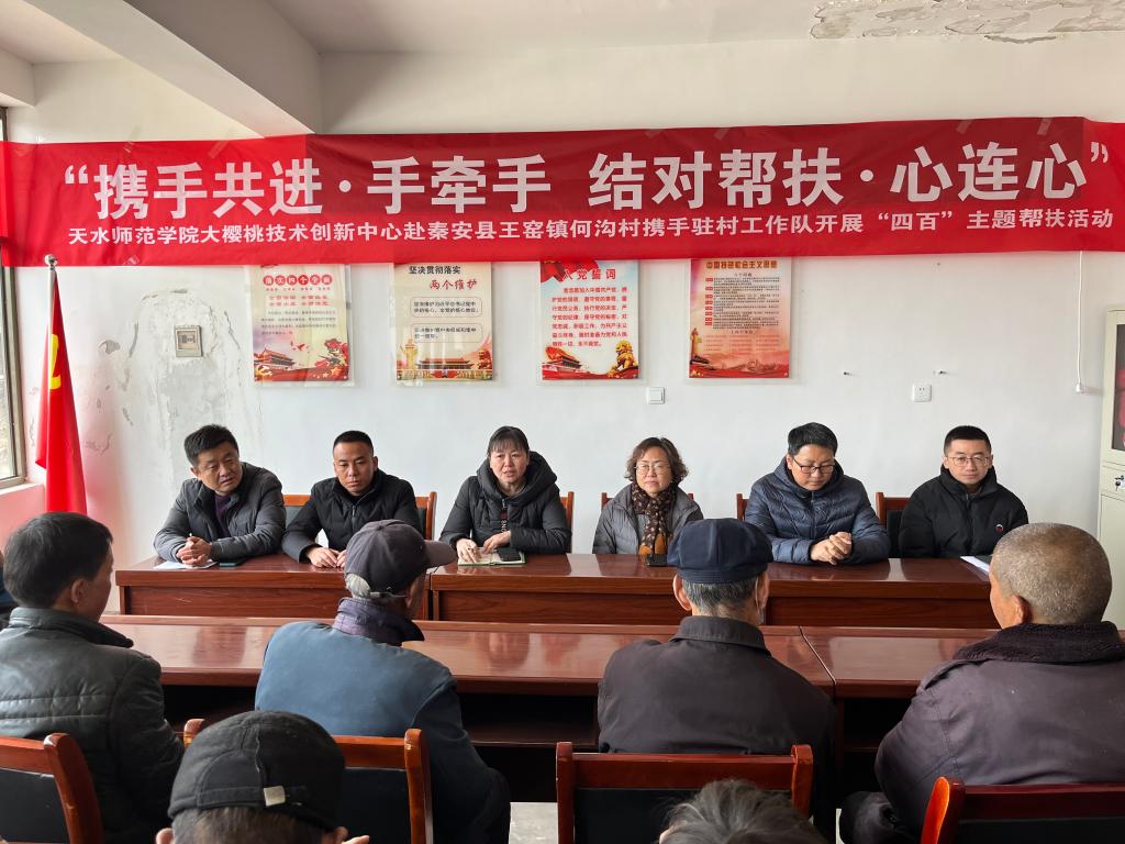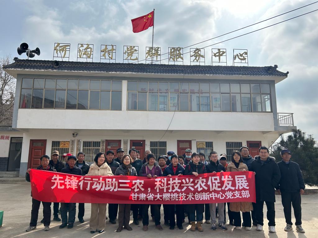 为深入贯彻党的二十届三中全会精神,充分发挥党建引领作用,助力乡村振兴,3月7日,甘肃省大樱桃技术创新中心党支部联合秦安县王窑镇何沟村党支部、驻村帮扶队,在何沟村开展了“党建引领助春管,技术惠农促振兴”主题党日活动。来自科研、基层党组织及果农代表共50余人参与了活动。