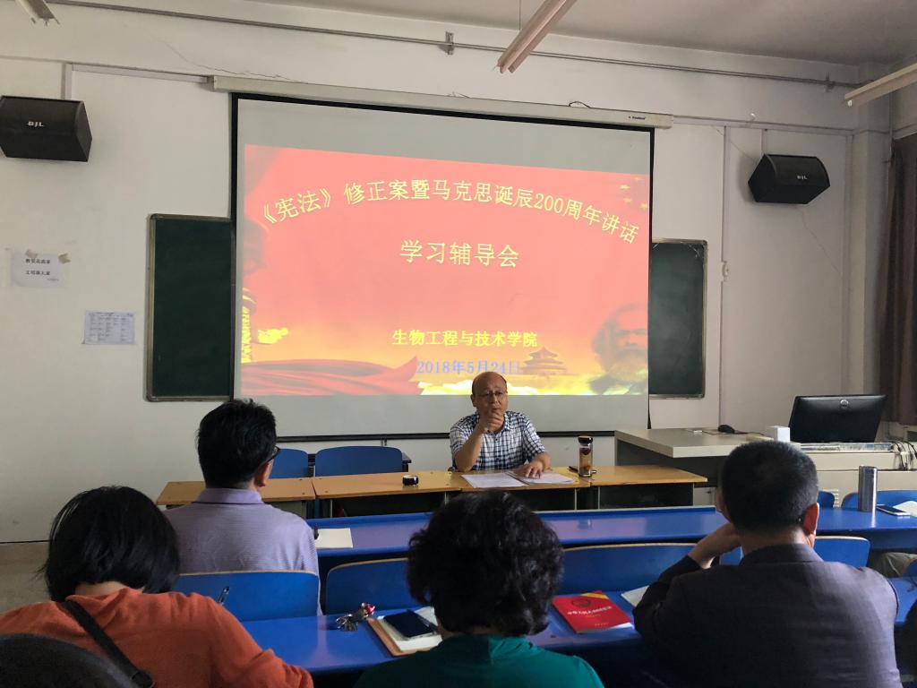 5月24日下午,Ky开元集团党总支邀请学校党委委员、统战部部长崔亚军在3号实验楼414多媒体教室,为Ky官网师生对新修宪法和习近平在马克思诞辰200周年大会上的重要讲话精神进行辅导学习。学院全体教工、学生党员、入党积极分子80余人参加学习,活动由总支书记马纲主持。
