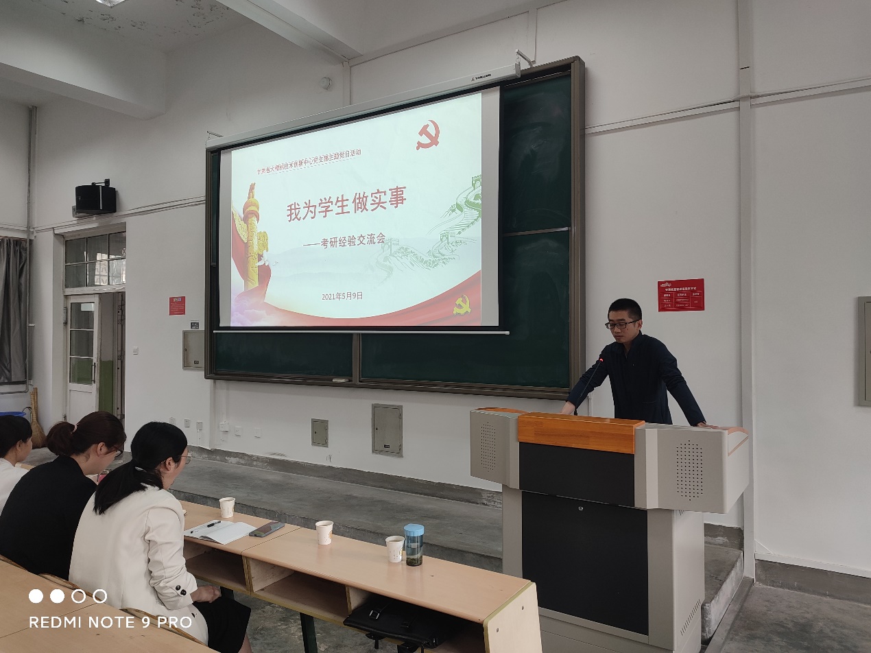 2021年是中国共产党成立100周年,为庆祝中国共产党百年华诞,讴歌党的光辉历程,发扬党的优良传统,强化教师责任担当,59日上午,甘肃省大樱桃技术创新中心党支部于2号教学楼121教室成功举办了主题党日活动——“我为学生做实事——考研经验交流会”。本次交流会由甘肃省大樱桃技术创新中心党支部组织委员李昭同志主持,支部党员及“中心”80余名学生参加了此次考研经验交流会。由生物学院2017级毕业生常梦佳、王娅蓉、邵鹏飞、邱雅敏和李亚丽同学作了精彩的考研经验报告。